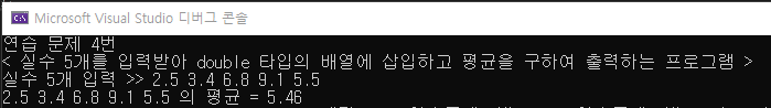printf("< 실수 5개를 입력받아 double 타입의 배열에 삽입하고 평균을 구하여 출력하는 프로그램 >\n");